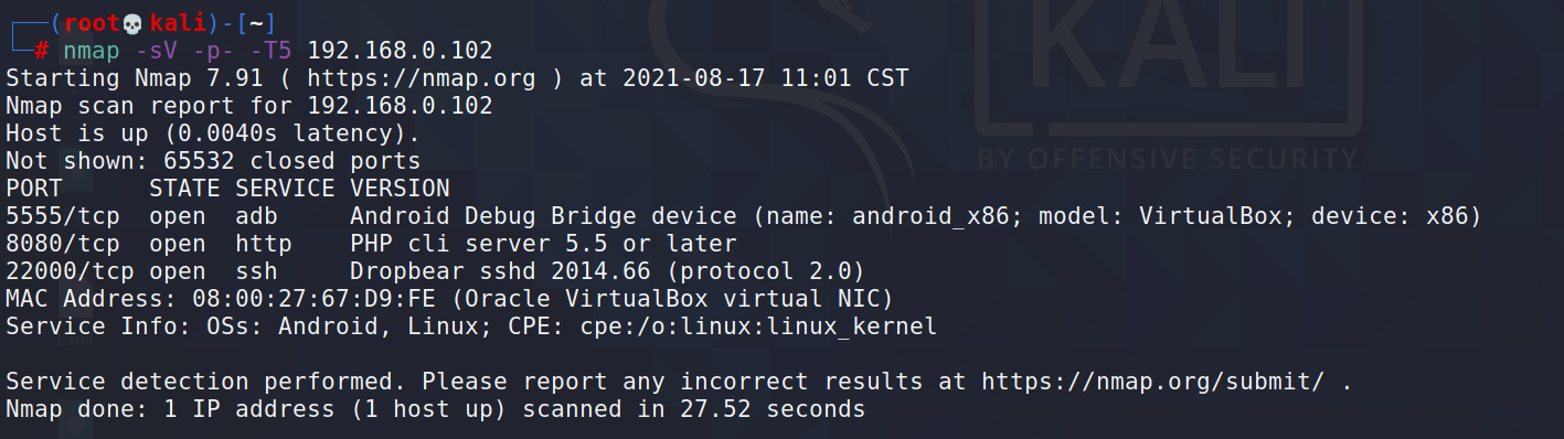 nmap -sV -p- -T5 192.168.0.102