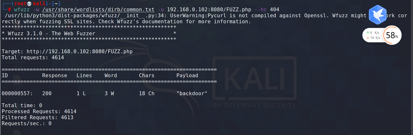 wfuzz -w /usr/share/wordlists/dirb/common.txt -u 192.168.0.102:8080/FUZZ.php --hc 404